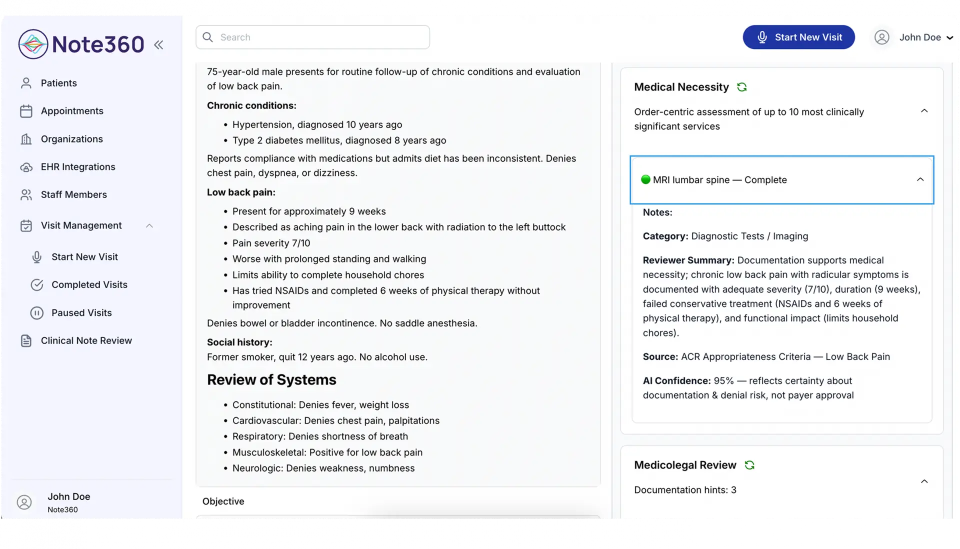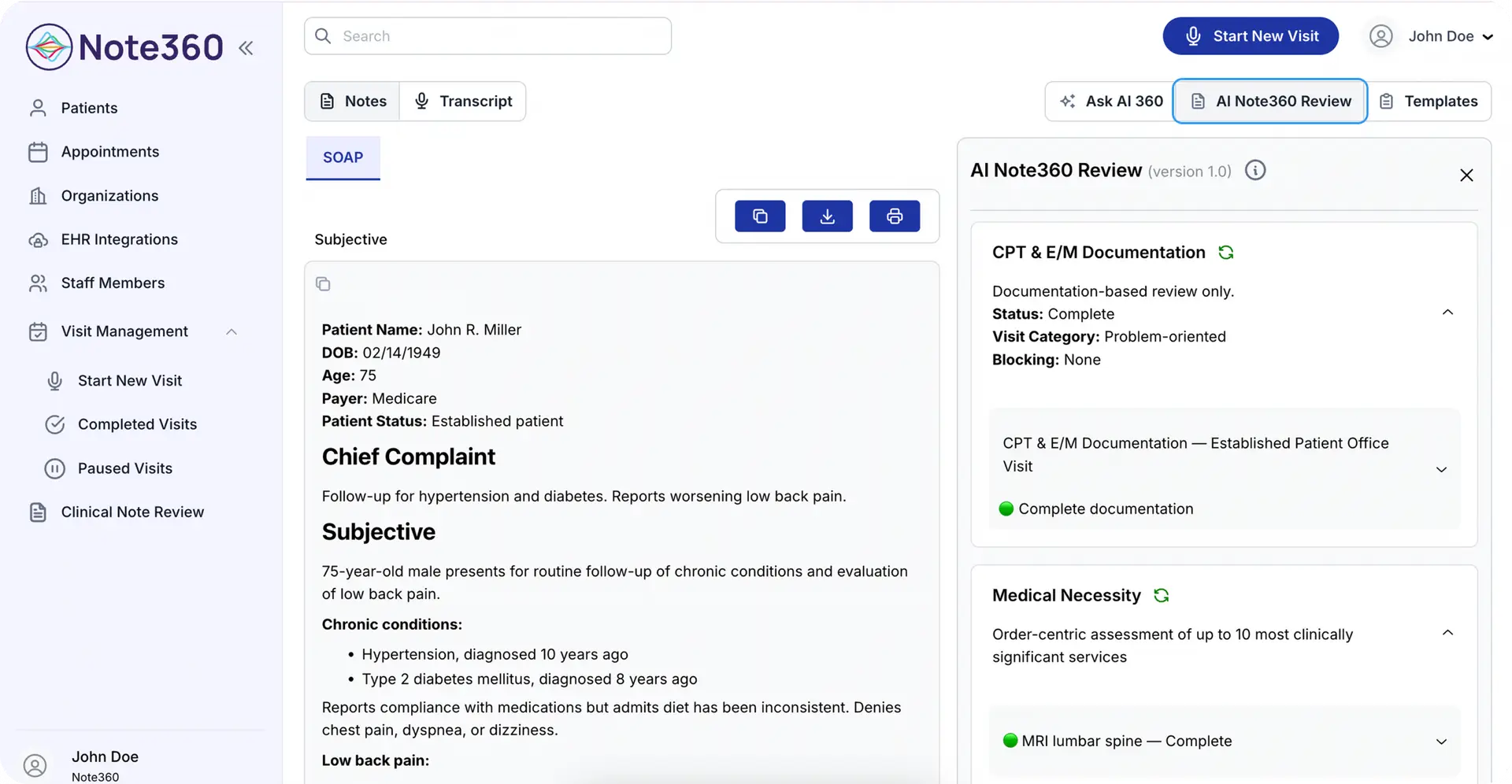 In addition to real-time, point-of-care analysis, Note360 provides retrospective documentation review to help teams identify recurring documentation patterns and gaps that may affect compliance, reimbursement, and documentation integrity.
