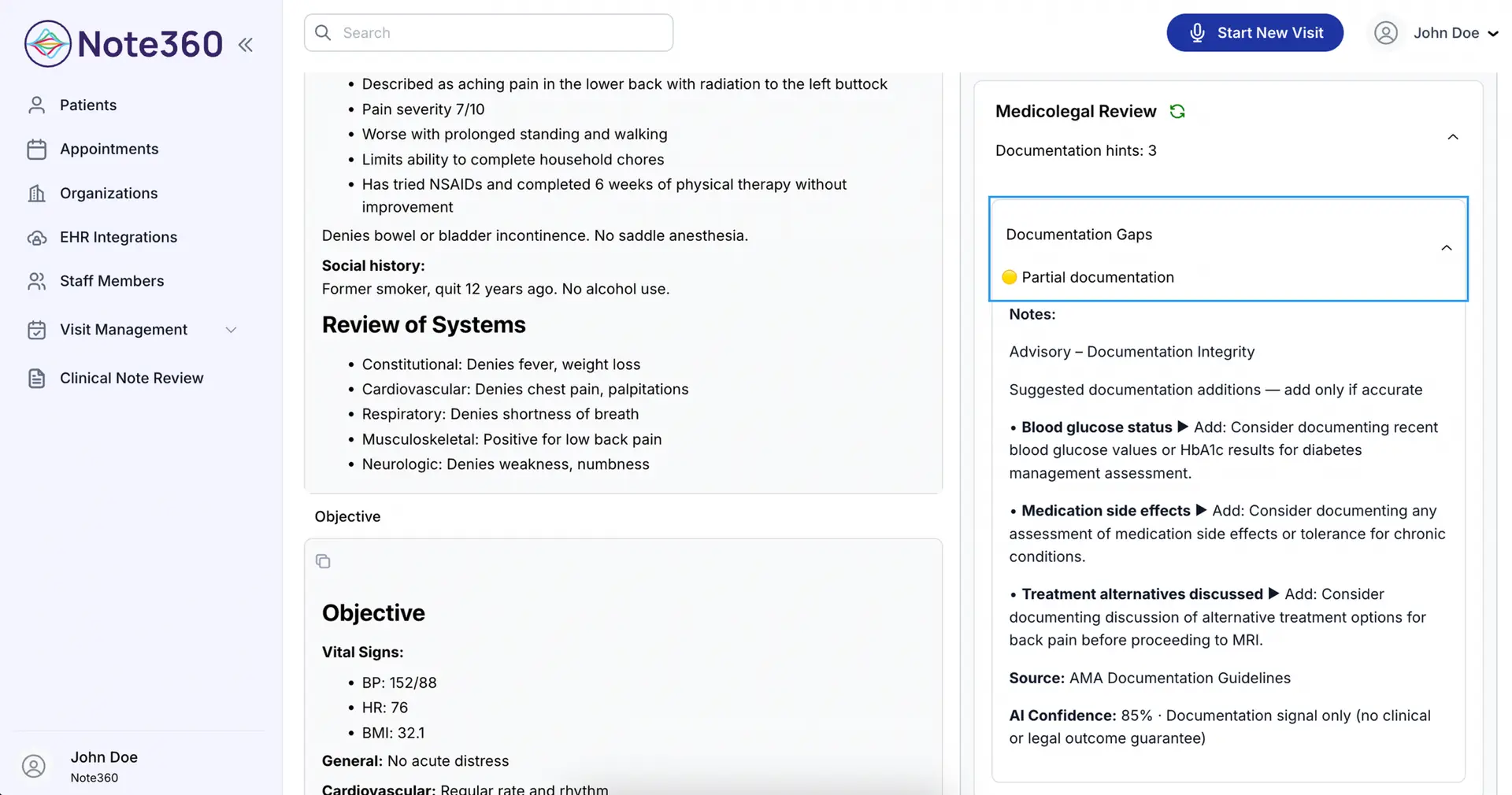 Note360 reviews only what is documented and highlights areas that may be unclear, incomplete, or missing important clinical context. By bringing visibility earlier in the workflow, clinicians and teams can address documentation gaps while the encounter is still fresh.