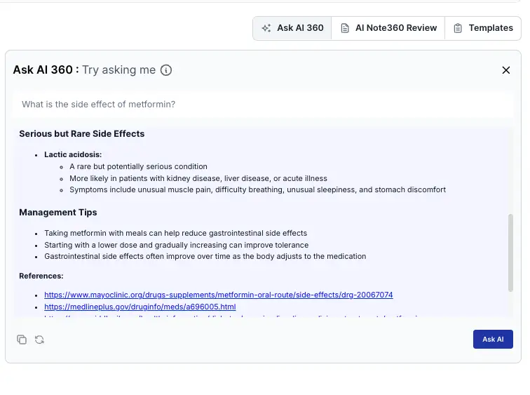 Ask AI 360 lets clinicians ask natural-language clinical or documentation questions and receive chart-grounded responses based on the patient’s context right at the point of care.
